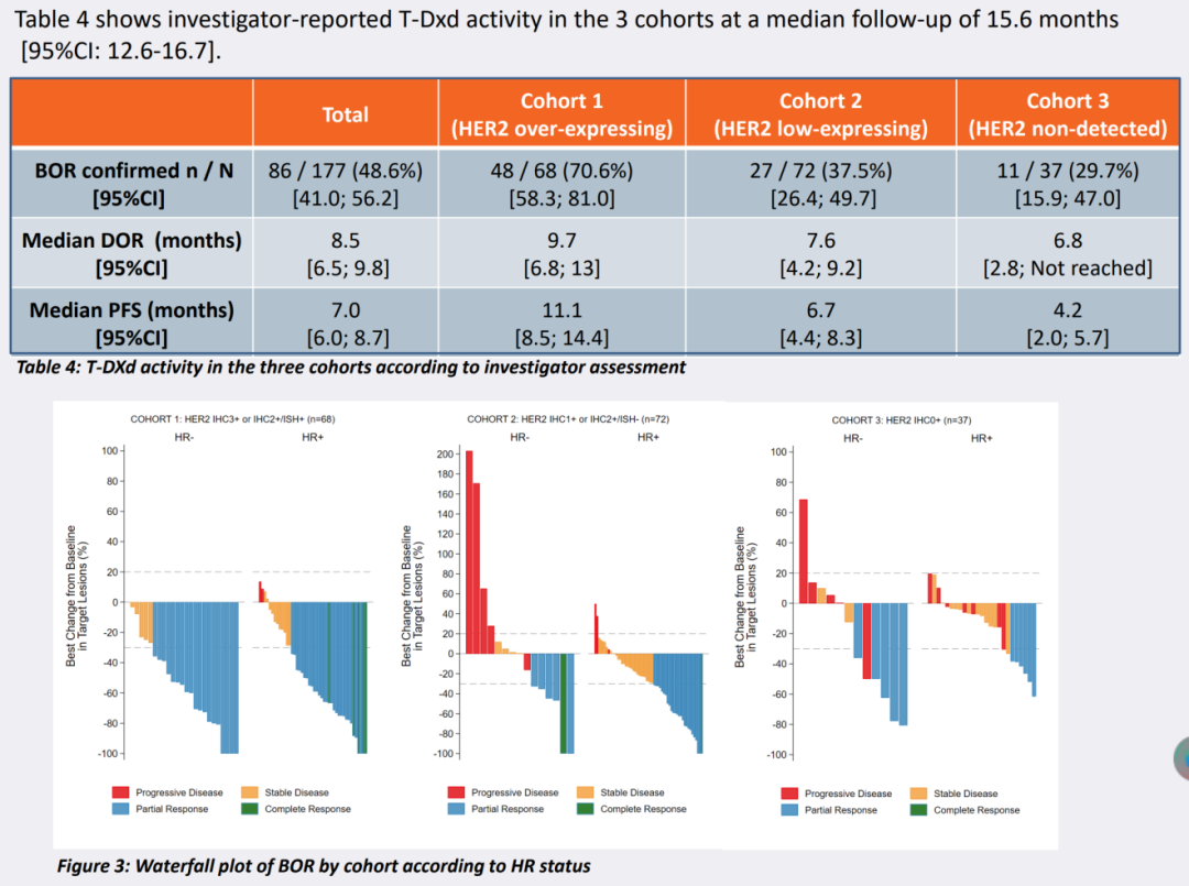 其次,正如步教授所言,HER2低表达的判定标准仍需进一步完善。虽然对于HER2低表达已有了初步定义,但临床实践中我们也关注到IHC 0-1+之间存在指南未能涵盖的病例,例如无法忽略的胞浆染色、未达到10%但染色中-强的……。2021年SABCS会议中,DAISY研究(Abstract PD8-02)显示,HER2 IHC 0队列亦能从抗HER2的抗体偶联药物T-DXd中获益,这从侧面反映了HER2低表达的标准有待于进一步完善。我们期待纳入更多HER2 0-1+病例的临床研究的结果,以更好地将病理判读标准与临床疗效结合起来。