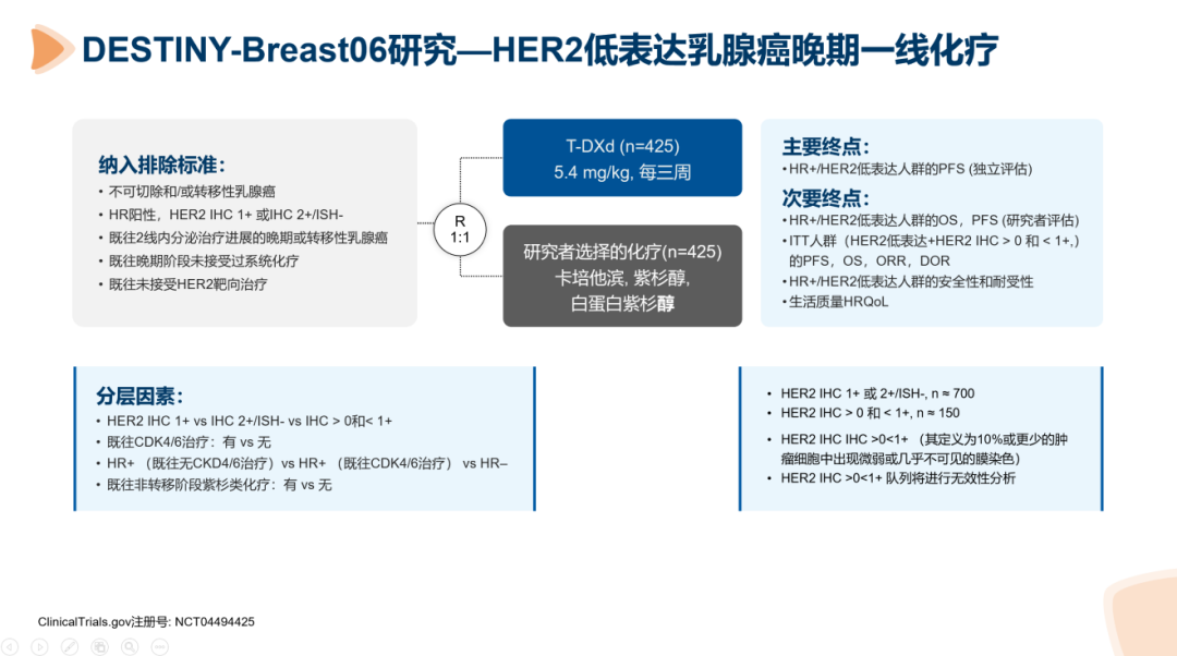 HER2低表达概念的提出源自T-DXd精准治疗的重要突破。I期DS8201-A-J101研究显示,对于HER2低表达晚期乳腺癌患者,中位既往治疗7.5线后,使用T-DXd可取得37.0%的客观缓解率(ORR)、中位无进展生存期(mPFS)达11.1个月,中位疾病控制时间(mDOR)10.4个月。在此基础上开展的III期研究DESTINY-Breast04、DESTINY-Breast06进一步探索HER2低表达晚期乳腺癌患者中T-DXd的疗效与安全性。2022年2月21日,DESTINY-Breast04试验重磅宣布达到主要研究终点,结果显示,与化疗方案相比,无论激素受体状态如何,T-DXd在PFS、OS方面均取得显著改善,续写HER2治疗的未来。