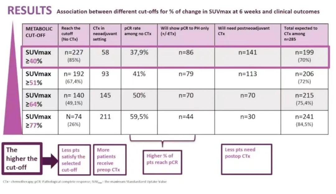 PHERGain试验中定义SUVmax较基线降低至少40%为对??F-FDG-PET有反应。本研究在PHERGain试验的基础上,探索了用于预测pCR的SUVmax在2周期新辅助后较基线下调的最佳截断值。
