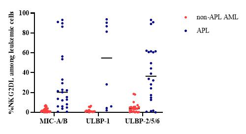 自然杀伤细胞(NK)是机体抗肿瘤免疫的第一道防线,多项研究证实,NK细胞具有强大的抗白血病作用。NKG2D是NK细胞重要的激活性受体,它通过识别肿瘤细胞表面的配体(NKG2DL: MICA/MICB,ULBPs1–6)传递活化信号并激活免疫系统,在肿瘤细胞杀伤中起关键作用。然而在AML中,NKG2DL配体被金属蛋白酶切割,以可溶性形式从AML细胞表面释放到血清中,并可促进NK细胞NKG2D的下调,从而使NK细胞杀伤活性降低,造成AML的免疫逃逸和不良预后。目前关于NKG2DL在APL中的表达的研究仍然缺乏。
