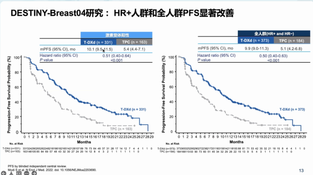 DESTINY-Breast04研究是首个T-DXd在HER2低表达乳腺癌中达到PFS和OS终点的Ⅲ期临床研究。研究入组人群为HER2低表达、既往1-2线化疗、90%为HR+乳腺癌且判定为不能从内分泌治疗中获益的晚期患者。入组患者随机分两组,2/3患者应用T-DXd,1/3患者应用医生选择的化疗方案(TPC),如卡培他滨、艾立布林,吉西他滨,紫杉类等。主要终点是HR+患者的PFS,关键次要终点是全人群的PFS、HR+患者的OS和全人群的OS。研究结果显示,HR+人群中T-DXd组的中位PFS为10.1个月,TPC组为5.4个月,疾病进展或死亡风险显著降低49%(HR 0.51,95%CI:0.40~0.64,P<0.001);全人群中T-DXd组的中位PFS为9.9个月,TPC组为5.1个月,疾病进展或死亡风险显著降低50%(HR 0.50,95%CI:0.40~0.63,P<0.001)。