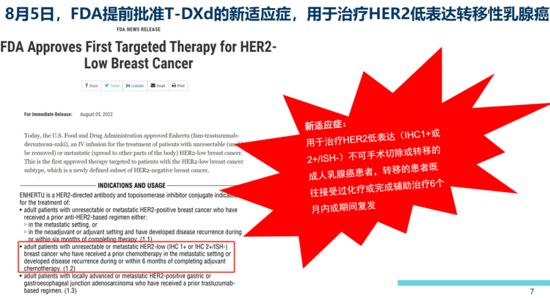 张永强教授介绍到,从HER2阳性到HER2低表达人群,T-DXd使得接受治疗的患者ORR得到显著提升,并使OS获益延长。鉴于DB-03研究的良好结局,ASCO、NCCN、ABC6、CSCO BC等最新版国内外指南均将T-DXd作为HER2阳性乳腺癌患者的二线治疗推荐方案,也因此改写了HER2阳性晚期乳腺癌患者的二线治疗格局。同时,基于DB-04研究结果的公布,T-DXd开启了乳腺癌HER2低表达治疗领域新格局。6月21日,2022年第4版NCCN指南新增T-DXd作为HER2 IHC1+或2+/ISH-,经过至少1线化疗患者的优选方案,HR+患者需要为内分泌难治性(1类证据)。8月4日,ASCO 2022 HER2-指南快速进行了更新,将T-DXd作为了既往经治HER2低表达乳腺癌患者的治疗推荐。8月5日,FDA提前批准了T-DXd的新适应症,用于治疗HER2低表达转移性乳腺癌。