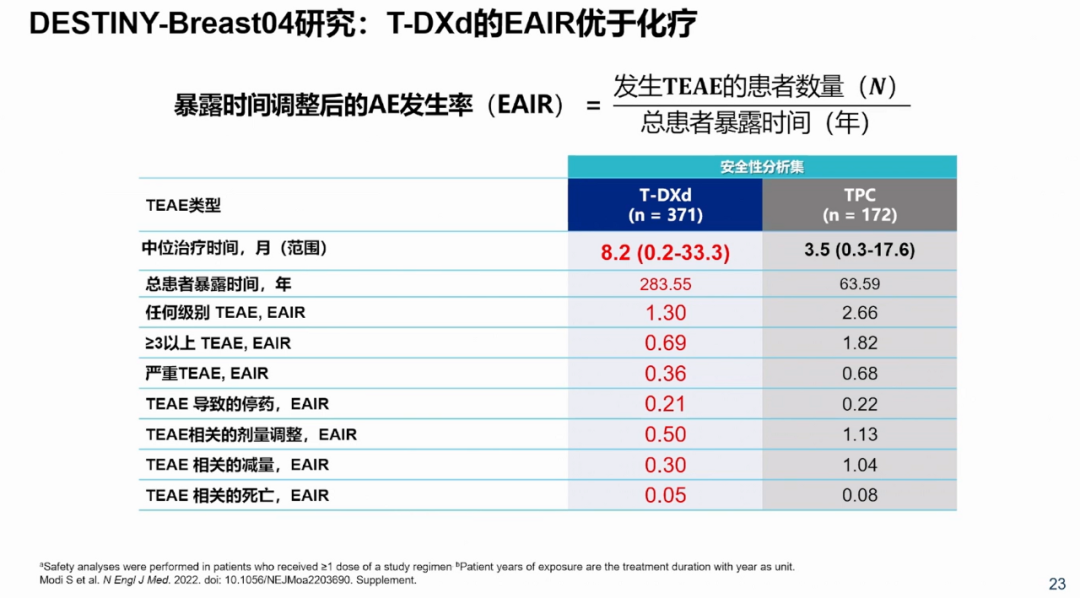 在安全性方面,T-DXd总体上优于TPC,≥3级TEAE发生率低于TPC(52.6%vs 67.4%),药物相关的中断(28.6%vs 36.0%)或减量(20.8%vs 37.2%)发生率均低于TPC,尤其是在调整暴露时间后的AE发生率(EAIR)中,T-DXd的任何级别TEAE、≥3级TEAE、停药、减量等均低于TPC。