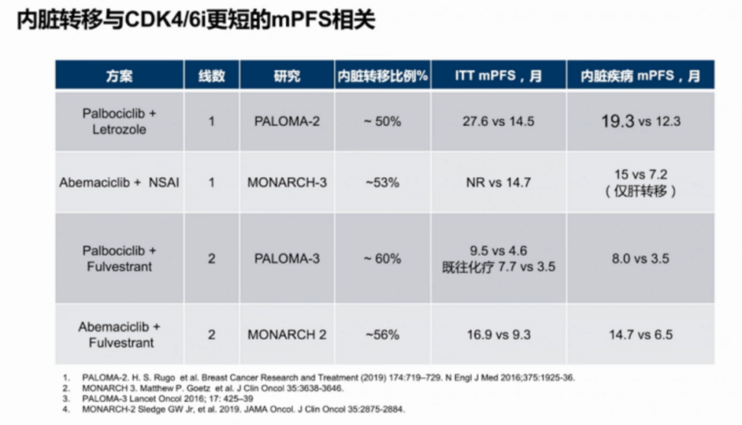 陈占红教授进一步从HER2-Low HR+MBC和HER2-Low mTNBC介绍当前的治疗格局变化。对于HER2-Low HR+MBC,在DESTINY-Breast04研究中,T-DXd组的PFS和OS均相较于TPC组有显著改善,ORR也由16.3%提高到了52.6%。在亚组分析中可见,HR+患者从T-DXd后线治疗中的PFS获益约为9~12个月,而且该研究中有64%的患者是经过CDK4/6i治疗、超过66%的患者基线存在内脏转移。那么,HER2-Low是否会影响CDK4/6i的疗效?从ASCO报道的一项研究(abs 1056)来看,HER2-Low并不影响CDK4/6i的疗效;总结CDK4/6i的系列研究来看,内脏转移与更短的mPFS相关。DESTINY-Breast04研究中T-DXd针对CDK4/6i经治、内脏转移的患者仍有效,这类人群是当前临床实践中的治疗难点,仍有巨大未满足临床需求。