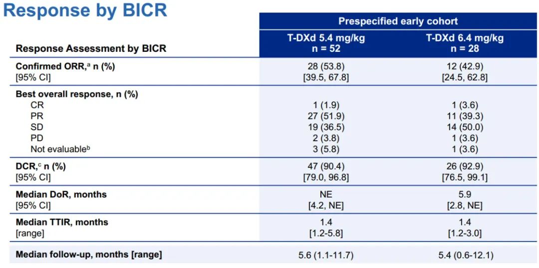 截止2022年3月24日,对预先设定早期队列(Prespecified early cohort)中分配接受5.4mg/kg T-DXd的52例患者和接受6.4mg/kg的T-DXd的28例患者进行了评估。在安全性分析集中,101例患者被分配接受5.4mg/kg方案,50例患者被分配接受6.4mg/kg方案。