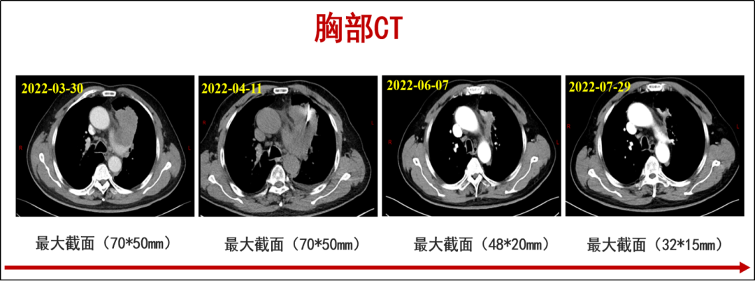 2022-04-20行依托泊苷+顺铂化疗治疗1周期(家属未同意使用PD-L1,考虑价格昂贵,生存获益少)。2022-05-14行依托泊苷+顺铂化疗第2周期,再度沟通病情及治疗情况,根据斯鲁利单抗ASTRUM-005研究数据及相对亲民的价格,家属决定使用免疫治疗,第2周期起联合斯鲁利单抗;2022-06-07评估病情示PR,胸腹部CT:1、肺CA复查:左肺上叶肿块,较前缩小(最大截面48*20mm);纵隔内多发肿大淋巴结;两上肺间隔旁型肺气肿;左肺舌段少许不张;2、肝囊肿,双肾囊肿;前列腺增生伴钙化。2022-06-09、07-03行依托泊苷+顺铂化疗,同时联合斯鲁利单抗免疫治疗2周期。2022-07-29评估病情示PR,胸腹部CT:1、肺CA复查:左肺上叶肿块,较前(2022-06-07)缩小;两上肺间隔旁型肺气肿;左肺舌段少许不张;2、肝囊肿,双肾囊肿;前列腺增生伴钙化。2022-07-30行依托泊苷+顺铂化疗,同时联合斯鲁利单抗免疫治疗1周期,患者目前仍在治疗疗程中。