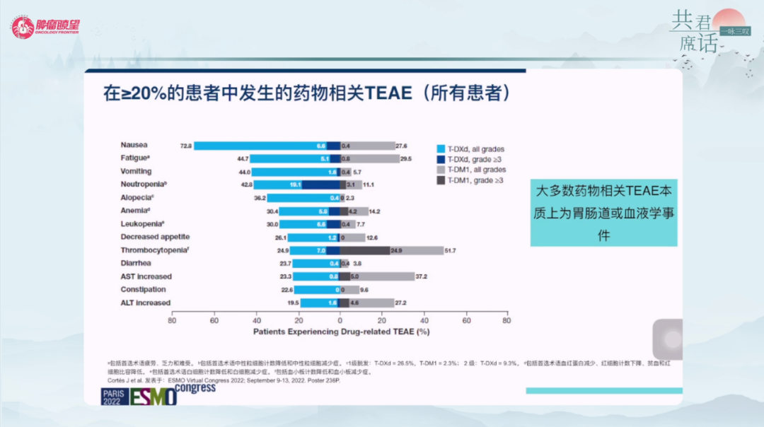 安全性方面,T-DXd的常见治疗相关的不良事件(TEAE)多为恶心呕吐、乏力、中性粒细胞减少,安全可控。