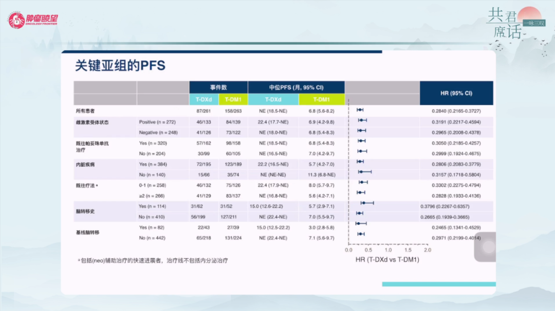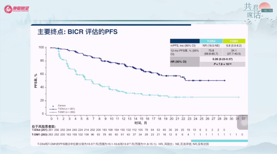 T-DXd组(n=261)与T-DM1组(n=263)的基线特征分布均衡,中位治疗2线,约一半为激素受体阳性,20%左右的患者存在脑转移,70%左右的患者存在内脏转移,超过99%的患者既往接受过曲妥珠单抗治疗,超过60%的患者接受过帕妥珠单抗治疗。结果显示,T-DXd vs T-DM1,BICR评估的mPFS为未达到vs 6.8个月,HR=0.28(95%CI 0.22-0.37),P=7.8X10-22;研究者评估的mPFS为25.1个月vs 7.2个月,HR=0.27(0.20-0.35),P<0.001;OS尚未成熟,12个月OS率为94.1%vs 85.9%,HR=0.56(95%CI 0.36-0.86),P=0.007172,在治疗的1-2个月即能显示差异;确认的ORR为79.7%vs 34.2%,疾病控制率(DCR)96.6%vs 76.8%,疗效差异巨大。
