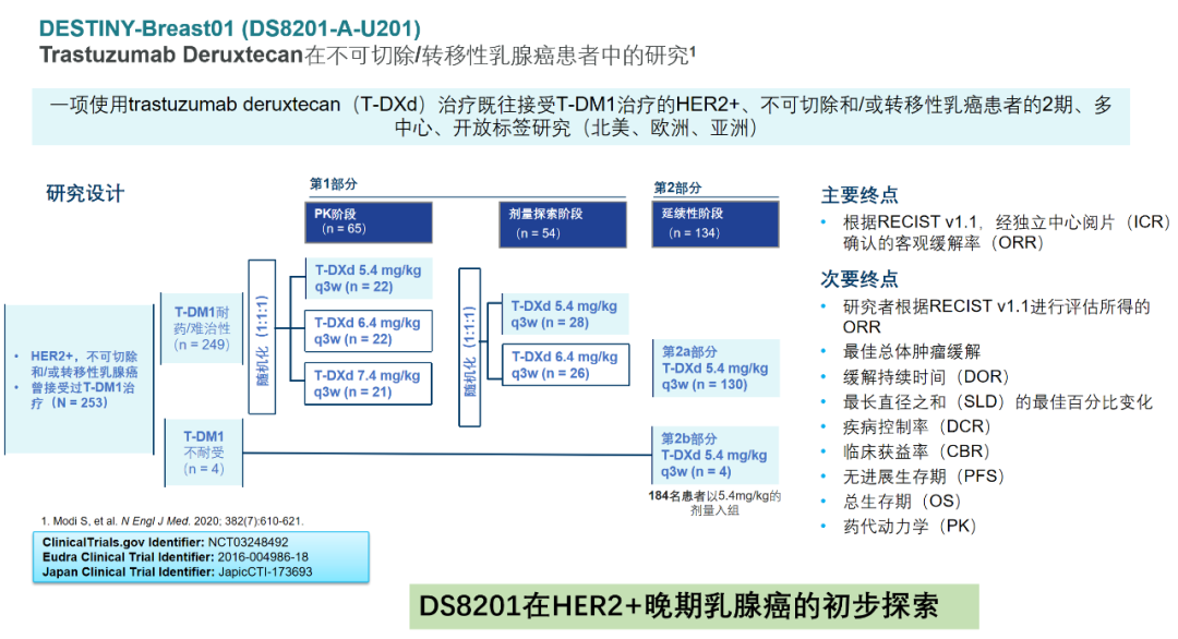DB-01研究是T-DXd在HER2+晚期乳腺癌领域初步探索的“开篇华章”。这项国际多中心、开放标签、2期试验包括第一部分的PK、剂量探索阶段和第二部分的延续性阶段,入组患者是接受过T-DM1治疗的不可切除或转移性HER2+乳腺癌。