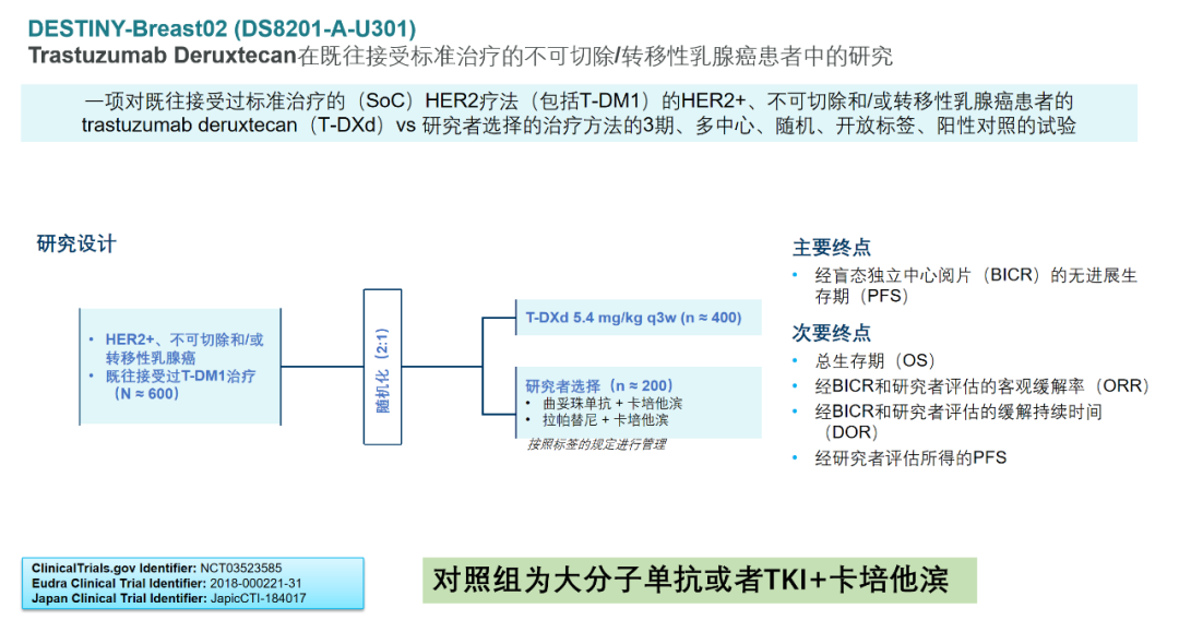 DB-02研究是在DB-01基础上开展的国际多中心、开放标签、3期试验,入组患者同样是经过T-DM1治疗的不可切除或转移性HER2+乳腺癌。研究组患者接受标准剂量T-DXd(5.4 mg/kg q3w,n≈400)治疗,对照组则是由研究者选择的当前三线/后线标准疗法大分子单抗或TKI联合化疗(曲妥珠单抗或拉帕替尼+卡培他滨,n≈200)。研究的主要终点是经盲态独立中心阅片(BICR)评估的PFS,次要终点包括OS、BICR或研究者评估的ORR和DOR、研究者评估的PFS。