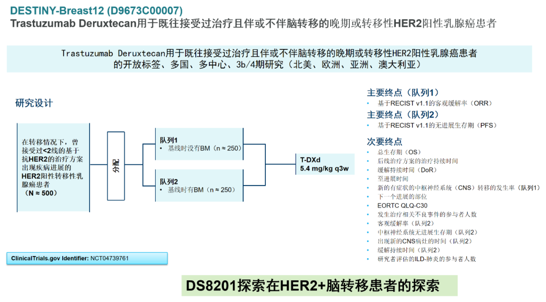 入组患者(n≈500)为接受过<2线抗HER2治疗的患者,其中队列1患者在基线时没有脑转移(n≈250),队列2在基线时有脑转移(n≈250),主要终点是队列1的ORR和队列2的PFS。该研究将为T-DXd治疗脑转移患者提供更大样本的信息。