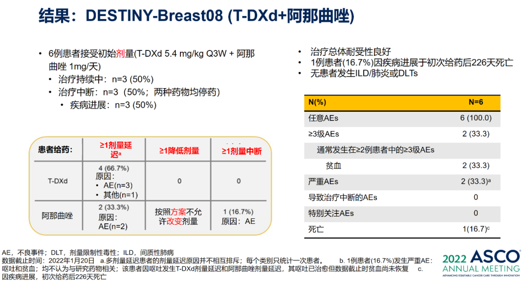 2022年ASCO大会报道了T-DXd+帕妥珠单抗的剂量探索结果,确定该方案的RP2D(T-DXd 5.4 mg/kg Q3W+帕妥珠单抗420mg;帕妥珠单抗负荷剂量840mg),7例患者中有5例(71.4%)仍在治疗中,2例(26.8%)治疗中断(撤回知情和射血分数降低各1例);3例(42.9%)≥3级AEs,没有间质性肺病(ILD)/非感染性肺炎或剂量限制毒性(DLTs)发生,无死亡事件。