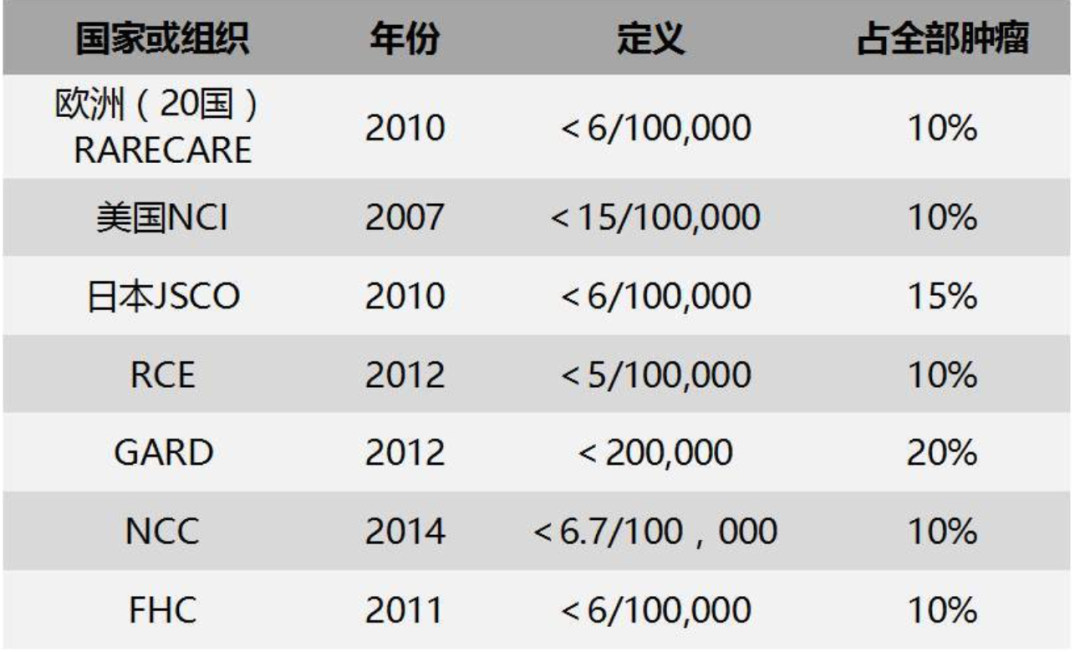 和罕见病一样,有些肿瘤因为发病率比较低而被称为罕见肿瘤。然而,目前国际上仍缺乏对罕见肿瘤定义的统一标准。例如,欧洲罕见肿瘤监测网络(RARECARE)的定义为发病率<6/10万,美国国家癌症研究所(NCI)和食品药品监督管理局(FDA)的定义为<15/10万,而中国罕见肿瘤平台研究的定义为<2.5/10万。