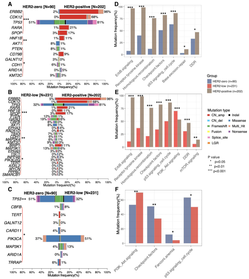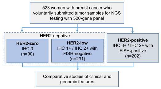 该研究招募在广东省人民医院(GDPH)诊断为乳腺癌的女性患者进行基因组研究,患者自愿提交样本进行下一代测序(NGS),通过回顾性分析523例中国乳腺癌女性患者的分子、临床和生存数据,研究HER2 0(IHC 0)、HER2低表达(IHC 1+或IHC 2+/FISH阴性)和HER2阳性(IHC 3+或IHC 2+/FISH阳性)状态的乳腺肿瘤的基因组特征。采用基因大Panel对所有乳腺肿瘤组织进行靶向NGS,以全面阐明其体细胞基因突变状况。并根据HER2表达状态比较乳腺癌亚型、分子特征、病理学完全缓解(pCR)和无病生存期(DFS)数据等。