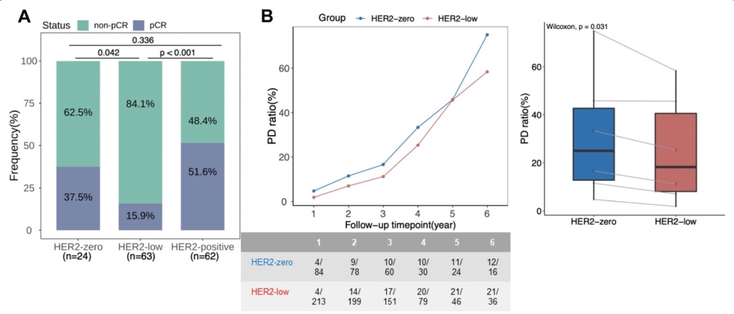研究还分析了所有患者的DFS,不管pCR状态、HR状态和基于IHC的分子亚型如何,HER2低表达和HER2 0亚组的DFS相当(p=0.271)。但是应注意的是,DFS数据仅10.1%(53/523)的成熟度,结果可能不确定。因此,研究者进行了进一步分析,在不同HER2亚组中比较经历过疾病复发患者(n=53)的DFS。正如预期的那样,HER2 0(n=12;p=0.025)和HER2低表达(n=21;p=0.031)女性患者的DFS显著短于HER2阳性患者(n=20);然而,HER2 0和HER2低表达亚组之间的DFS相当。但有趣的是,在各随访时间点,HER2低表达亚组复发/进展患者的比例显著低于HER2 0亚组(p=0.031;图5B)。