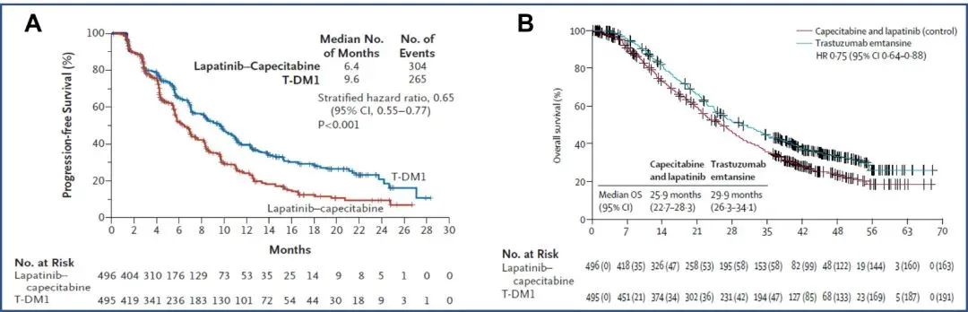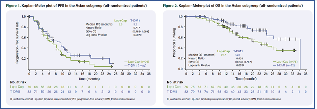 图3.EMILIA亚洲人群数据.A:总人群PFS分析;B:总人群OS分析