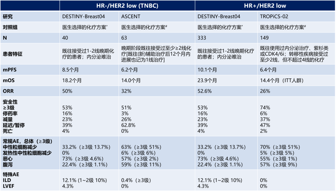 表1.T-DXd及SG在HER2低表达人群中的主要研究数据汇总(非头对头比较).*DESTUNY-Breast-04研究中医师选择的化疗方案为卡培他滨、艾日布林、吉西他滨、紫杉醇或白蛋白结合型紫杉醇;#ASCENT及TROPiCS-02研究中医师选择的化疗方案为卡培他滨,艾立布林,长春瑞滨或吉西他滨;AE数据均为各研究中ITT人群的统计结果。