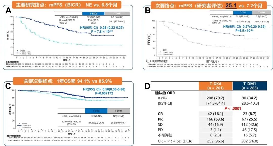 图6.DESTINY-Breast03研究结果.A:独立评审委员会评估的PFS;B:研究者评估的PFS;C:1年OS率;D:客观缓解率