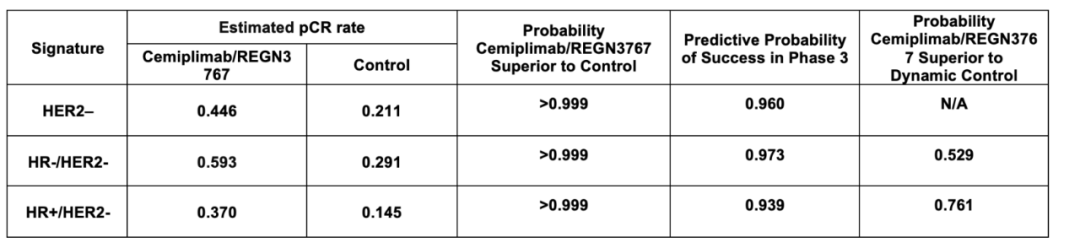 方法:入组标准为肿瘤≥2.5 cm的女性患者;HER2-或MP高风险的HR+患者。治疗方案为12个周期、每周一次的紫杉醇80 mg/m2联合4个周期、每3周一次Cemiplimab 350 mg以及4个周期、每3周一次的REGN3767 1600 mg,然后为4个周期、每2周一次阿霉素/环磷酰胺(AC)。对照组为12个周期、每周一次紫杉醇,然后为4个周期、每2-3周一次的AC。Cemiplimab/REGN3767可以在3/10个指定分型中完成:HER2-、HR-/HER2-和HR+/HER2-。为符合不断变化的护理标准,我们使I-SPY 2与外部数据构建包含了“最佳”替代疗法的“动态对照”,并估计Cemiplimab/REGN3767优于动态对照的可能性。使用治疗前基因表达数据和ImPrint signature评估反应预测亚型(免疫+亚型与免疫-亚型)。