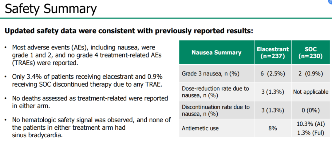 elacestrant组中8%的患者应用了止吐药,SOC组10.3%的患者应用了止吐药。研究人员观察到,该研究中没有患者发生心动过缓。