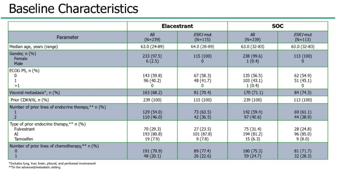 EMERALD(NCT03778931)是一项随机、开放的三期临床试验,招募既往接受过1-2线内分泌治疗、CDK4/6抑制剂和至多1次化疗的ER+/HER2-转移性乳腺癌患者;允许既往使用过氟维司群。患者被随机1∶1分配到elacestrant组(每日口服400毫克)或标准内分泌治疗组(SOC,研究者选择AI或氟维司群)。如果随机分配到对照组,既往接受氟维司群治疗的患者将接受AI,反之亦然。