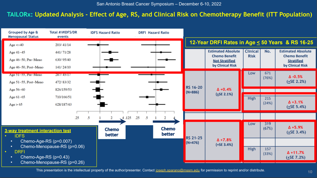 Dr.Kaklamani:今年我们提供了12年的数据。Joseph Sparano教授报告了最新的分析结果,并显示出与前几年相似的结果,因为我们知道化疗似乎对RS评分中危的患者没有好处,但研究根据女性是绝经前还是绝经后以及她们的年龄进行了更详细的分析。研究能够进一步证明的是,对于40岁以下的女性,如果她们的RS评分为16-25,化疗似乎对她们没有好处;但对41岁到50岁之间的绝经前女性确实有好处,而45-50岁的绝经后女性并没有受益。我想大概的意思就是化疗可能会帮助年轻女性,因为它会使她们处于绝经后状态,但对于年龄在41岁到45岁之间的绝经前患者群体来说,化疗似乎是真的有效。在这些患者群体中,我们应该考虑进行化疗。