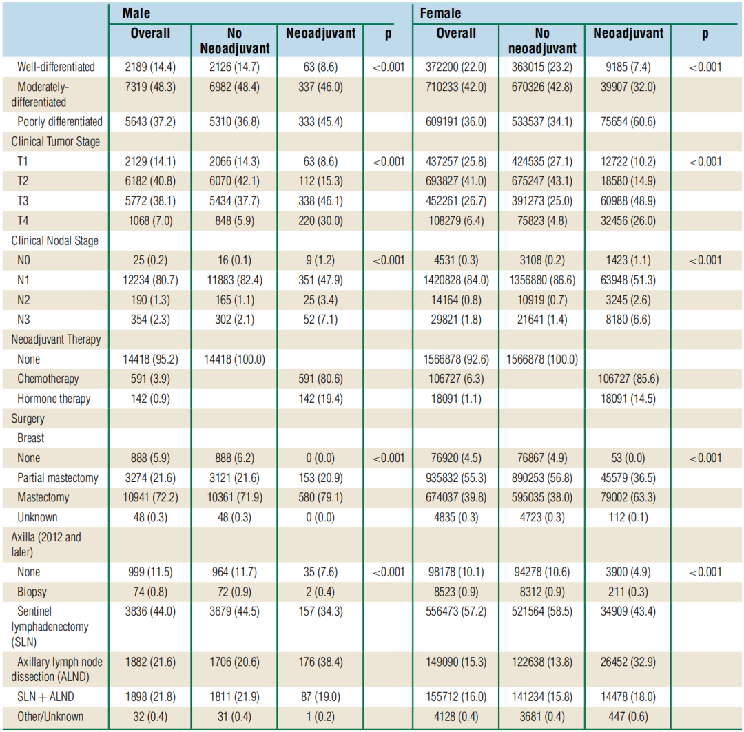 研究人员对2004年至2017年美国国家癌症数据库(NCDB)的的数据进行了回顾性分析。研究人员首先确定了所有诊断为非转移性侵袭性乳腺癌患者(AJCC临床期Ⅰ-Ⅲ期),并根据性别、临床肿瘤分期(非局部晚期cT1/2;局部晚期cT3/4),以及患者是否接受了NT进行了分层。