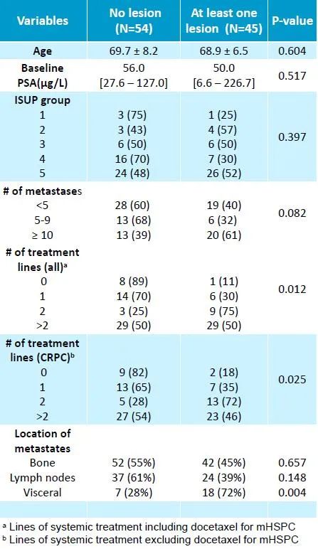 患者中位年龄、PSA和转移灶数分别为70岁[44-87]、50.1 ng/mL[17.9-210]和4个[3-99]。纳入研究时,9.1%、19.2%、14.1%和57.6%的患者已接受过0、1、2或>2线的前列腺癌系统治疗(不包括去势治疗)。45%的患者发现≥1个的PSMA-/FDG+PET病灶。在接受0、1、2或>2线系统治疗的患者中,≥1个PSMA-/FDG+PET病灶的患者比率分别为11.1%、26.3%、64.3和52.6%(p=0.007,Cochran-Armitage检验)。25例患者之后接受了PSMA-RLT治疗,其中8例(32.0%)患者经中心定量盲法分析发现有≥1个PSMA-/FDG+PET病灶。系统治疗的线数和存在内脏转移与PSMA-/FDG+PET病灶相关,详见表1。