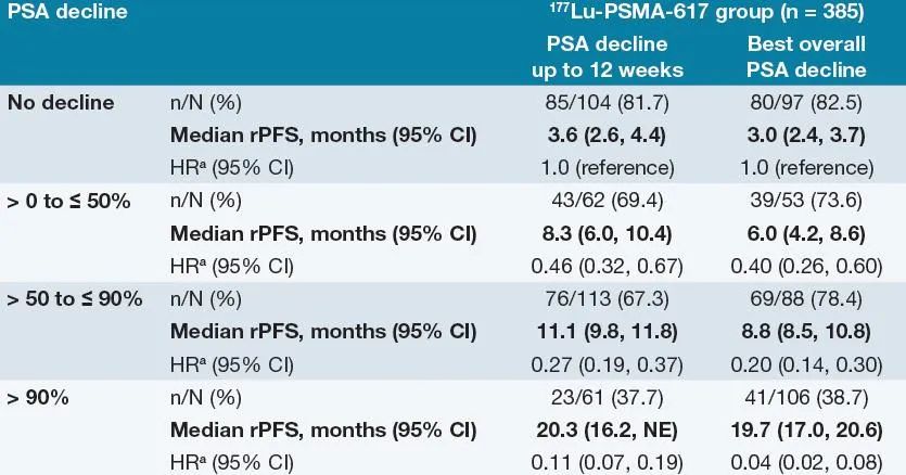 表2.接受177Lu-PSMA-617治疗的患者根据PSA下降幅度分层的中位rPFS