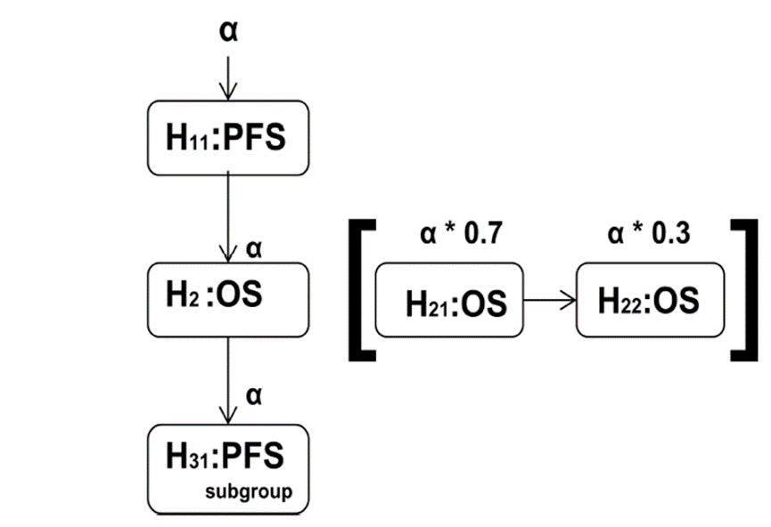 虽然该研究以PFS作为主要终点,但仍将OS作为关键次要终点。临床试验的次要终点通常有多个,多数情况下作为主要终点的补充和支持,而且次要终点结果不能作为确证性的结论,也不能写进药物说明书。然而,在某种情况下,有些次要终点可能用于支持药品说明书声称的获益,一般被称为关键次要终点。此时,应将关键次要终点与主要终点共同纳入I类错误控制,即假阳性概率的控制。对于注册性III期临床研究,假阳性概率必须控制在5%以内的水平。只有主要终点的检验达到显著性后,才会考虑关键次要终点的检验。除此之外,通常还要对关键次要终点进行样本量计算,制定完备的统计分析计划;如果有期中分析,还要有详细的期中分析计划。此类设计的一个典型例子是FLAURA研究。在FLAURA研究中,主要终点是PFS,关键次要终点是OS。该研究采用了顺序检验的方式来进行I类错误的控制,在获得PFS阳性结果以后才进行正式的OS统计学分析。虽然FLAURA研究的主要终点并不是OS,但是作为关键次要终点,且经过如此严格的统计学设计,其OS阳性结果仍然可以得到广泛认可,可以写进药物说明书。