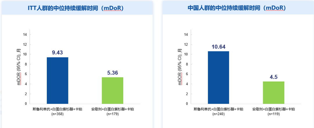 ASTRUM-004研究的ORR和DOR结果同样出色。ITT人群ORR为64.2%,中国亚组人群ORR高达75%,ITT人群DOR为9.43个月,中国人群DOR为10.64个月。从这些数据可见,中国亚组有四分之三的患者达到PR或CR,而且一旦达到PR或CR,中位持续时间可以达到10.64个月。高ORR和长DOR的结果也为ASTRUM-004研究获得具有临床意义和显著统计学差异的PFS延长奠定了坚实的基础。