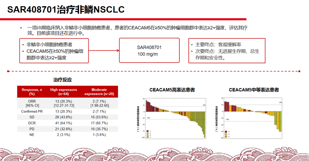 SAR408701在晚期nsqNSCLC展现了积极的抗肿瘤活性,3期CARMENLC03将进一步评价SAR408701对比多西他赛用于晚期经治的、CEACAM5高表达的NSCLC患者;此外,也有其他联合治疗的探索,包括联合雷莫芦单抗(NCT04394624)、联合帕博利珠单抗(NCT04394624)的2期研究。