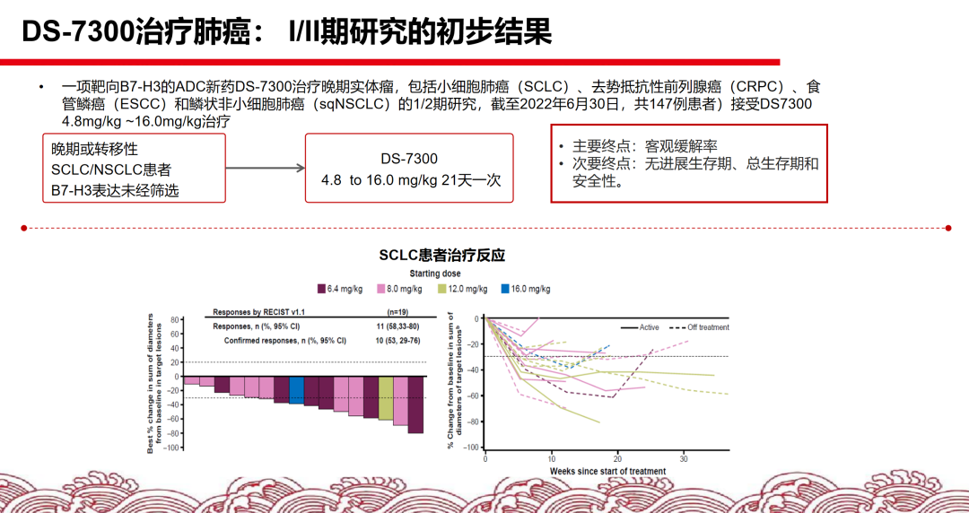 DS-7300a是一种靶向B7-H3的ADC,由B7-H3单克隆抗体MABX-9001a、拓扑异构酶Ⅰ抑制剂DXd通过可裂解四肽连接子构成,DAR为4。2022年ESMO大会报道的一项1/2期DS7300-A-J101研究,入组了147例晚期实体瘤患者,在19例SCLC患者中,有11例达到缓解(其中10例为确认PR),确认ORR(cORR)达53%,中位DOR为5.5个月[28](点击查看更多),为SCLC治疗带来了新的希望。DS-7300a用于ES-SCLC(接受过最多3种治疗且至少1种为铂类)治疗的2期研究(NCT05280470)已经启动,期待相关结果的报道。