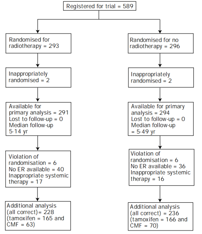 The Scottish breast-conserving trial,which was led by the late Sir Patrick Forrest in the 1980s,recruited 585 patients with early breast cancer(women under the age of 70 with tumors up to 4cm in size),and they received systemic therapy appropriate to their estrogen receptor status,either with tamoxifen for five years or until time of relapse,or systemic therapy with cyclophosphamide,methotrexate and 5FU,and then randomized either to a course of post-operative radiotherapy or no radiotherapy.