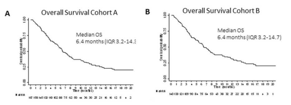 1.该研究的中位随访时间为13.8个月,整体患者(队列A)的中位总体生存(mOS)为6.4个月(下图中A),队列B(gilteritinib单药治疗)患者中位随访14.5个月,中位OS也为6.4个月(下图中B);无复发生存(RFS)为9.8个月;无事件生存(EFS)则为3.9个月,12个月的RFS、EFS和OS分别为37.3%(95%CI:18.2~56.5)、23.6%(95%CI:16.5~31.5)和31.4%(95%CI:22.4~39.7)。