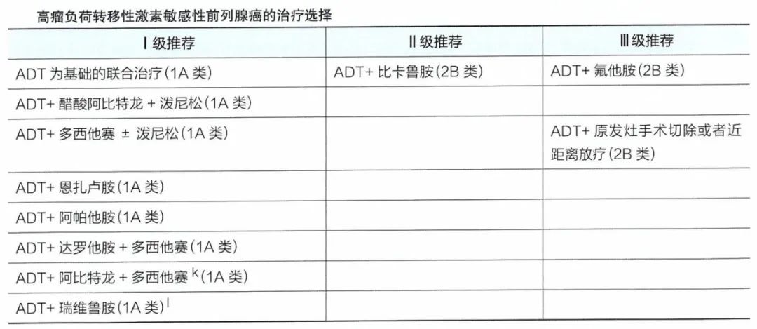 在高瘤负荷的mHSPC的治疗选择上,2022版指南更新了几个比较重要的部分,第一点为新增ADT+阿比特龙+多西他赛为I级治疗推荐,第二点是新增ADT+瑞维鲁胺方案并给予I级推荐。