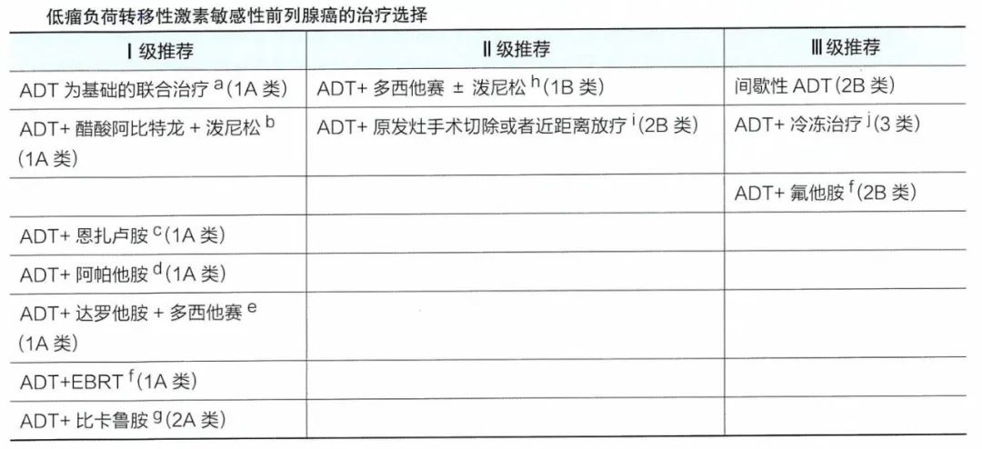 mHSPC的治疗需要分层来对待,根据CHAARTED研究的标准,将转移性激素敏感性前列腺癌分为高瘤负荷和低瘤负荷。高瘤负荷的定义为:出现≥4个骨转移灶(其中≥1个骨转移位于盆腔或脊柱以外)或出现内脏转移,不含以上因素则定义为低瘤负荷3。2022版指南针对低瘤负荷(表1)和高瘤负荷(表2)的mHSPC治疗方案的推荐分别如下。