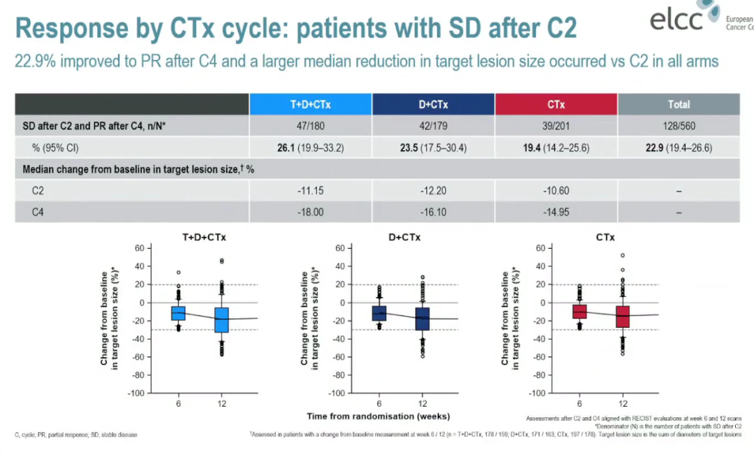 560例患者在第2周期化疗后达到疾病稳定(SD),其中22.9%(128例;95%CI:19.4%-26.6%)患者在第4个周期化疗后改善为部分缓解(PR)。按治疗组进行分组,三药组、双药组和单独化疗组分别有26.1%(95%CI:19.9%-33.2%)、23.5%(95%CI:17.5%-30.4%)和19.4%(95%CI:14.2%-25.6%)的患者(n=47)在第2周期后SD第4周期后PR。三个治疗组患者的中位靶病灶大小在第4周期时(-18.00;-16.10;-14.95)较第2周期(-11.15;-12.20;-10.60)时相对于基线缩小的幅度更大。