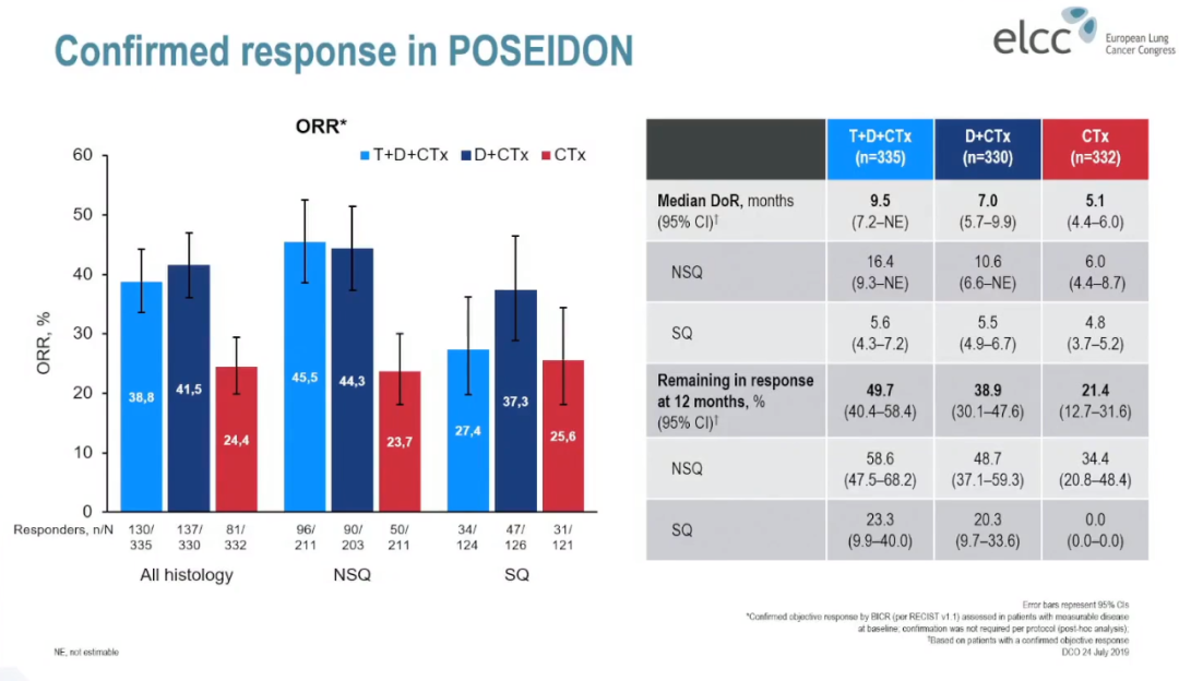 之前发表的POSEIDON试验的主要结果表明,联合Tremelimumab、度伐利尤单抗和化疗vs单独化疗在EGFR和ALK野生型转移性NSCLC患者中的无进展生存(风险比<hr/>=0.72;95%CI:0.60-0.86;P=0.0003)和总生存(HR=0.77;95%CI:0.65-0.92;P=0.0030)有统计学显著改善。与单独化疗相比,两种联合方案的客观缓解率(ORR)和缓解持续时间(DOR)也有所改善。这些数据是该治疗方案在美国、日本和欧盟获得批准的基础。[2]2023 ELCC报道了POSEIDON研究中2周期和4周期化疗后的结果,分析了化疗周期数和转移性NSCLC缓解模式的关系。