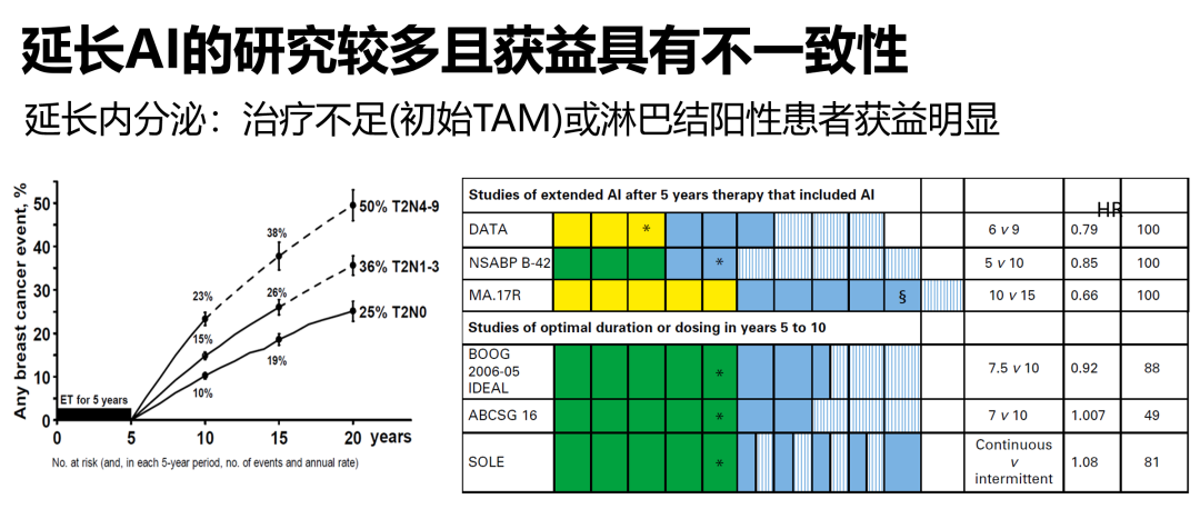 2022年ASCO对于BIG-198、SOFT、TEXT中的高危人群联合再分析8年的随访数据,这些高危患者,即使使用TAM转化为AI以及OFS联合的应用,5年IDFS率仅为73%。Meta分析显示ER+乳腺癌5年内分泌治疗(ET)后仍有长期的复发风险,至少50%的复发发生在诊断后5年以上。即使非常低微的T1N0的患者,内分泌治疗后的5到20年,累计复发风险仍可达14.1%。因此,高危人群需考虑延长内分泌治疗的策略。目前,延长AI的研究较多且获益具有不一致性。总体上,治疗不足(初始TAM)或淋巴结阳性患者延长内分泌治疗的获益明显。包括ASCO指南提出:如淋巴结阳性的乳腺癌患者应接受延长AI治疗,直至完成最长可达10年的辅助内分泌治疗。低风险淋巴结阴性的乳腺癌患者不应常规接受延长AI治疗。