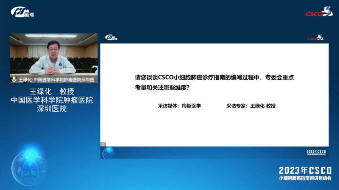答记者问环节中,王绿化教授提出CSCO小细胞肺癌专委会编写新版指南时,以循证证据为基础,综合考量患者疾病分期分层,治疗方案疗效、可及性,以及治疗模式的选择等方面,最终通过多学科协作(MDT)来为患者制定最佳的治疗方案。