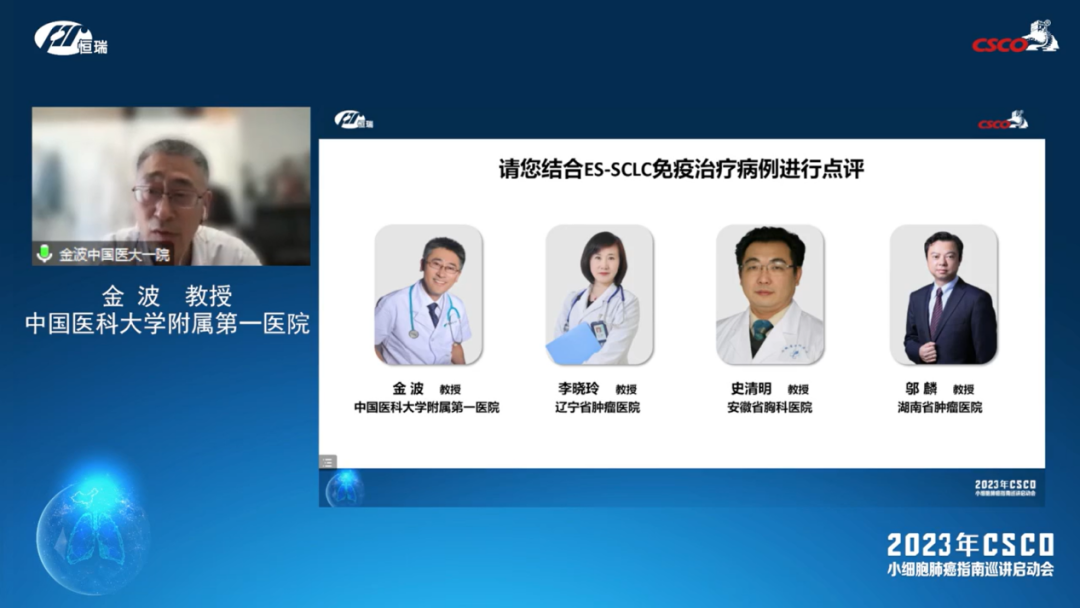 中国医科大学附属第一医院金波教授、辽宁省肿瘤医院李晓玲教授、安徽省胸科医院史清明教授及湖南省肿瘤医院邬麟教授围绕病例总体诊治过程展开了热烈地讨论,并就ES-SCLC患者一线免疫药物的治疗选择、疗效评估与预测以及免疫治疗获益人群的筛选等方面分享了远见卓识,引发与会多位专家的强烈共鸣。