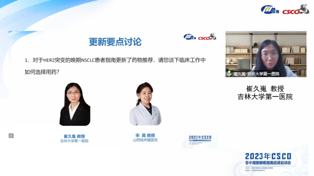 讨论环节中,吉林大学第一医院崔久嵬教授、山西省肿瘤医院宋霞教授、河南省肿瘤医院马智勇教授、山东第一医科大学第三附属医院盛立军教授、中国医学科学院肿瘤医院惠周光教授聚焦2023 CSCO指南更新要点展开了深入探讨,包括HER2突变晚期NSCLC后线治疗药物选择、CameL研究和CameL-sq研究4年更新长生存数据对中国临床的指导意义等。专家表示,药物可及性和基于中国患者生存的直接证据仍是临床实践的关键考量要素,吡咯替尼仍将是HER2突变晚期NSCLC后线治疗的可及治疗方案;CameL和CameL-sq均是在中国人群中开展的大样本III期研究,卡瑞利珠单抗联合化疗使近四成的非鳞癌患者生存超过了4年,耀眼数据可圈可点,卡瑞利珠单抗已纳入医保,堪当晚期NSCLC一线治疗中的标准治疗基石。