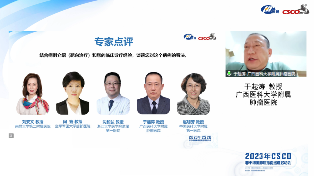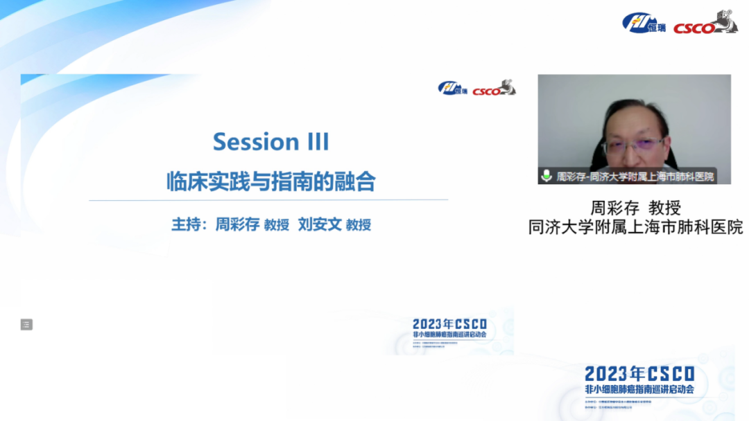 周彩存教授在总结中对与会专家的精彩分享表示感谢,同时感谢恒瑞医药的大力支持。免疫治疗重塑了NSCLC治疗格局,少见靶点逐渐有药可用,NSCLC领域正加速度前行。我们要敢于仰望星空,更要脚踏实地。这些重大进展都及时体现在了新版指南中,2023版CSCO指南巡讲已经扬帆起航,希望随着指南的推广和落地,新的研究进展切实转化为患者的获益,新的探索成果切实改变更多患者的生命。期待中国肺癌患者预后水平更上一层楼!