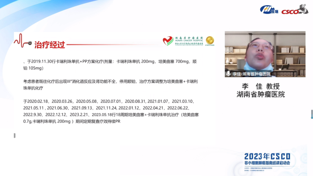 湖南省肿瘤医院李佳教授分享了1例ⅣB期原发性支气管肺腺癌老年病例诊治经过。患者伴有左肾上腺、骨等多发转移,肿瘤负荷重;EGFR、ALK阴性,PD-L1表达15%。基于CameL研究的出色数据以及卡瑞利珠单抗高效低毒、良好的可及性和经济性等多维优势,采用卡瑞利珠单抗+培美曲塞+顺铂一线治疗。2周期后,右上肺原发灶、转移淋巴结、左肾上腺转移灶均较基线时缩小,但同时发现乙状结肠转移,行姑息性乙状结肠Dixon术。术后继续接受卡瑞利珠单抗联合两药化疗,后续调整为联合培美曲塞单药,目前共已完成21个周期免疫联合化疗,仍在继续治疗中,疗效持续部分缓解(PR),PFS已达44个月,获得显著长生存获益。