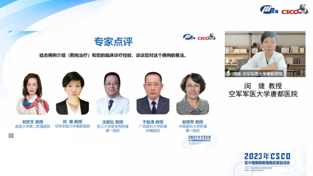 点评环节中,南昌大学第二附属医院刘安文教授、空军军医大学唐都医院闵婕教授、浙江大学医学院附属第一医院沈毅弘教授、广西医科大学附属肿瘤医院于起涛教授和中国医科大学附属第一医院赵明芳教授分享了真知灼见。专家谈到,吡咯替尼可靶向HER1/2/4三靶点,能够全面阻断HER家族同/异源二聚体下游通路,且与位点不可逆结合,这些药学优势为其强效抗肿瘤奠定了内在基础;从本例患者治疗中充分体现吡咯替尼的优异疗效,患者对阿法替尼耐药后,吡咯替尼有效“接力”,并实现了超长PFS,如此高龄患者能够坚持长期用药也反映了吡咯替尼良好的安全性和耐受性。