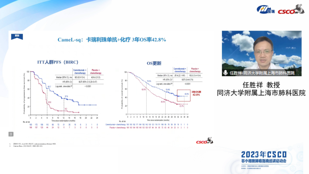 任胜祥教授解读了驱动基因阴性NSCLC的系统治疗更新要点。非鳞癌和鳞癌一线治疗Ⅰ级推荐阵列进一步壮大。同时,既往已成为Ⅰ级推荐方案的多项研究在2022年更新了数据。其中CameL研究公布了4年长生存数据,卡瑞利珠单抗联合化疗一线治疗驱动基因阴性非鳞状NSCLC,3年OS率达到39.3%,4年OS率高达37.2%,使超1/3患者生存突破4年。4年生存率相较3年,仅下降了2%,提示这些患者很有可能生存突破5年,那么随着随访时间的延长,相信卡瑞利珠单抗将进一步提高晚期患者5年生存率,让更多患者实现长期无病生存!中位OS和无进展生存期(PFS)相较对照组均取得显著延长,分别达27.1个月和11.0个月、两者均创下了当前同类Ⅲ期研究中的最长纪录。CameL-sq研究也更新了OS数据,卡瑞利珠单抗联合化疗一线治疗驱动基因阴性鳞状NSCLC的3年OS率达42.8%,中位OS达27.4个月,也是同类Ⅲ期研究中最长。尽管不同研究间无法直接比较,但足见卡瑞利珠单抗联合方案的卓越疗效。