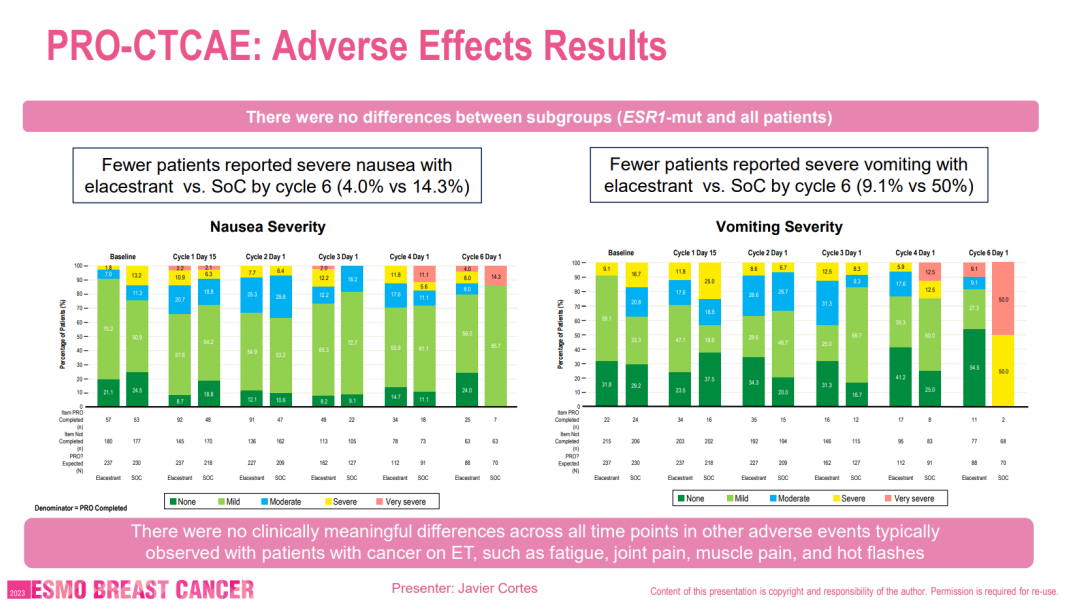 本次ESMO BC进一步报道了EMERALD研究的PRO结果,无论是总体人群还是ESR1突变人群,艾拉司群与内分泌治疗在欧洲癌症研究与治疗组织生活质量问卷-核心30问(EORTC QLQ-C30)、欧洲五维健康量表(EQ-5D-5L)、患者报告结局的不良事件通用术语标准(PRO-CTCAE)显示出了相近的生活质量,且艾拉司群的严重恶心呕吐更少6
