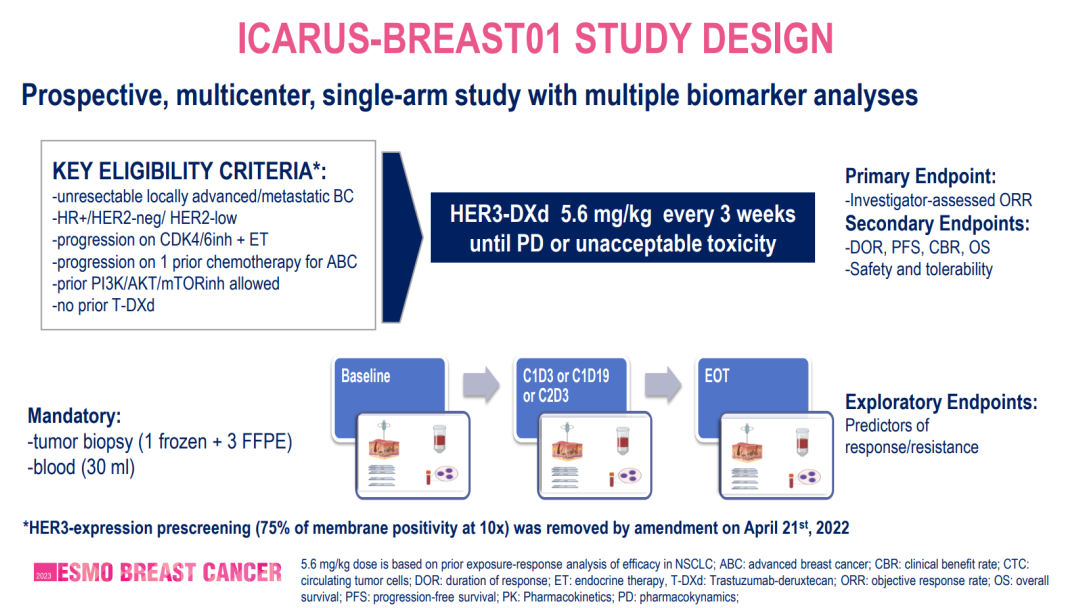 抗HER3治疗是近年的研究热点,本次ESMO BC大会重磅报道了该领域中ICARUS-BREAST01研究的最新进展。该研究是一项多中心、单臂、Ⅱ期研究,纳入CDK4/6抑制剂经治、晚期阶段接受过1次化疗后进展的HR+/HER2-晚期乳腺癌患者,不限定HER3表达。