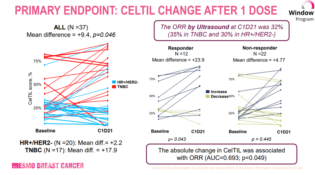 B部分则于本次ESMO BC报道了疗效和安全性。该部分纳入20例HR+/HER2-早期乳腺癌患者和17例早期三阴性乳腺癌(TNBC)患者,予以5.6mg/kg HER3-DXd,总体CelTIL指数具有统计学的显著意义(P=0.046)的变化。总体人群ORR为32%,TNBC人群ORR为35%;HR+/HER2-人群ORR为30%。CelTIL指数的绝对变化与ORR相关(AUC=0.693;P=0.049)。基线HER3水平与CelTIL指数变化或ORR无关,提示了CelTIL指数具有一定的疗效预测作用,但仍需更多数据积累与支持12